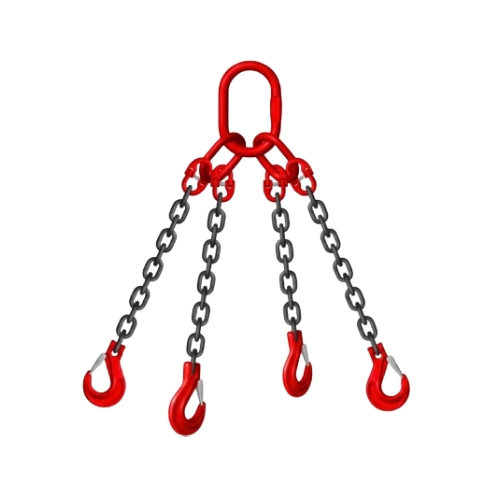 Ağır yüklerin güvenli taşınması için tasarlanmıştır. Üç kollu yapısı, yük dağılımını eşit şekilde sağlayarak yüksek stabilite sunar. - Dört Bacaklı Zincir Sapan